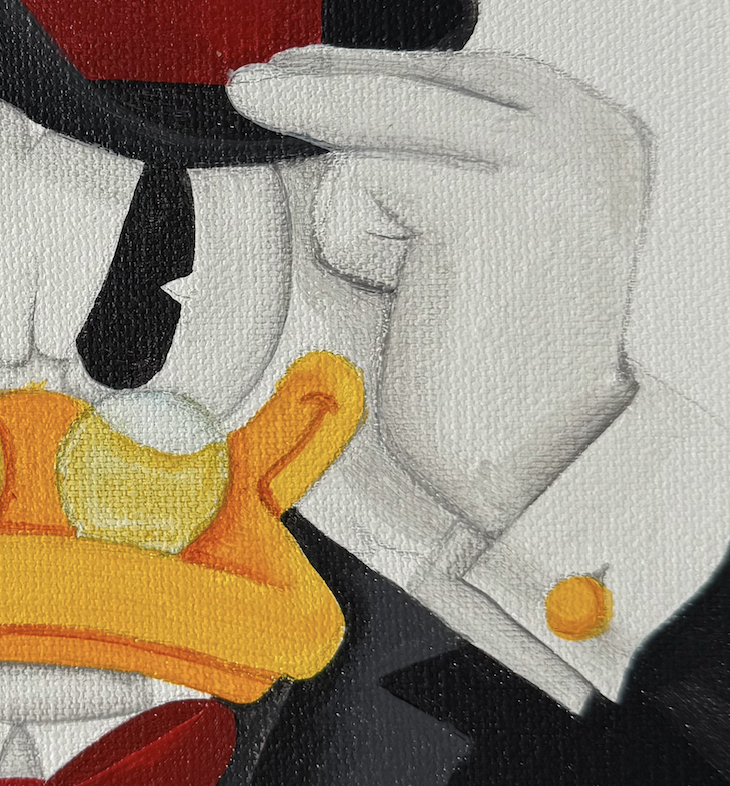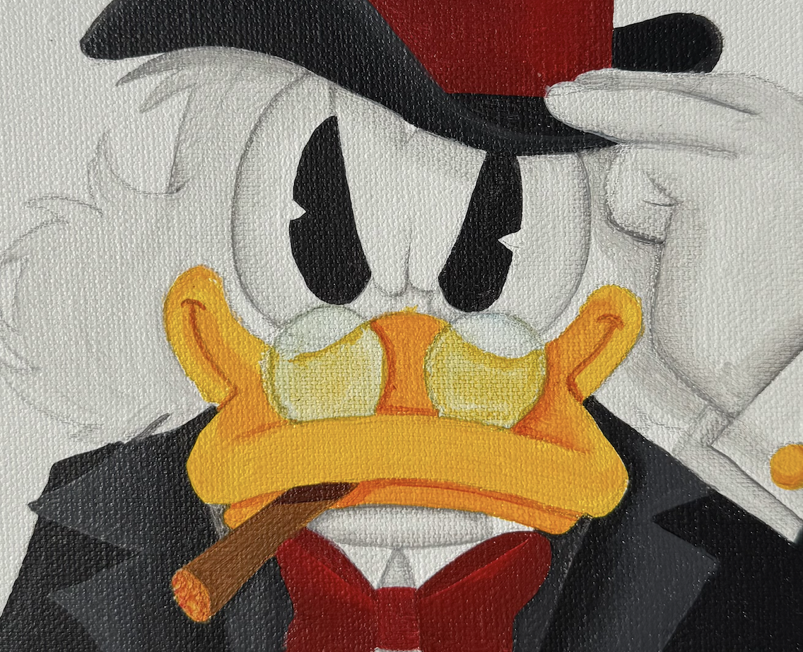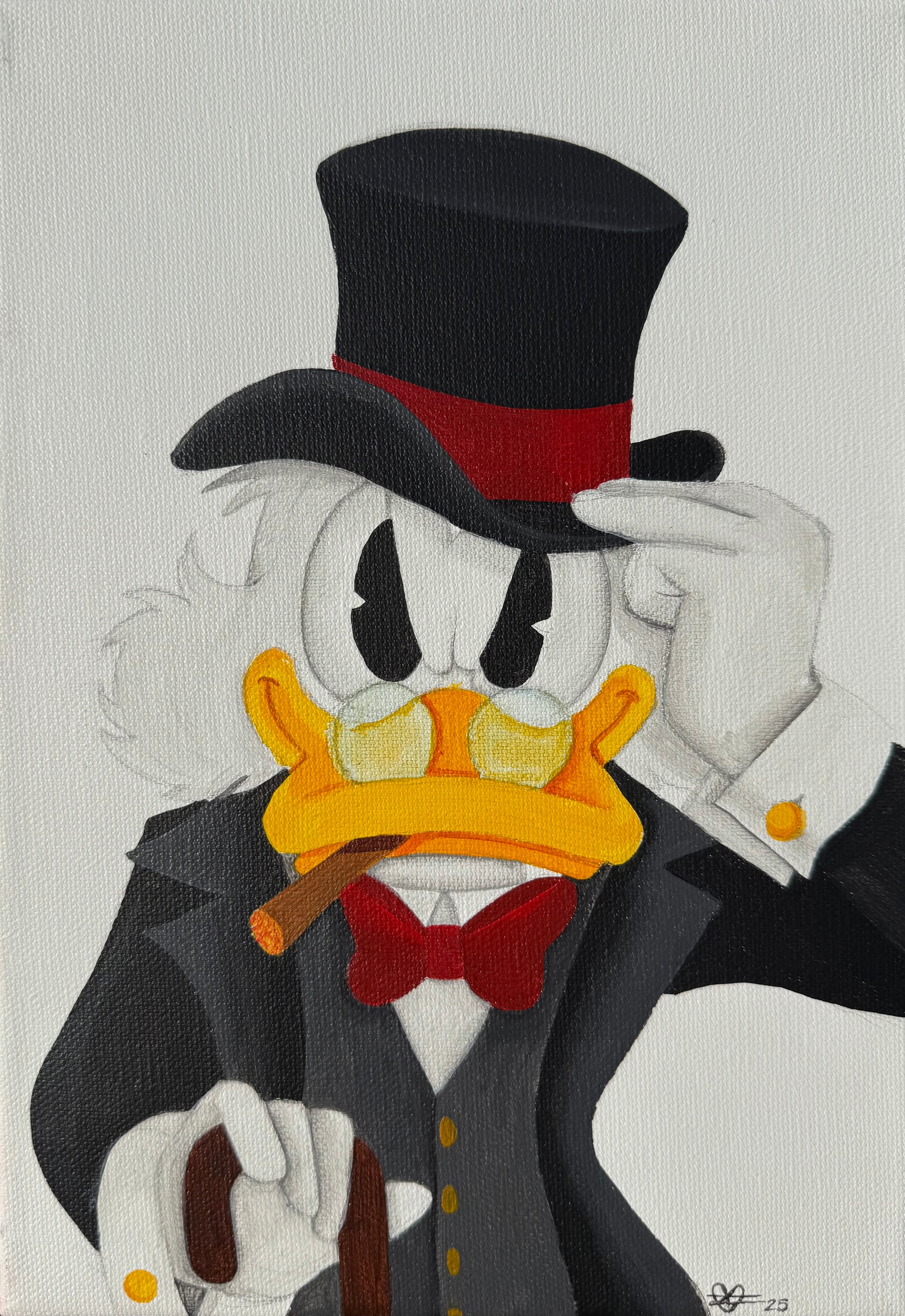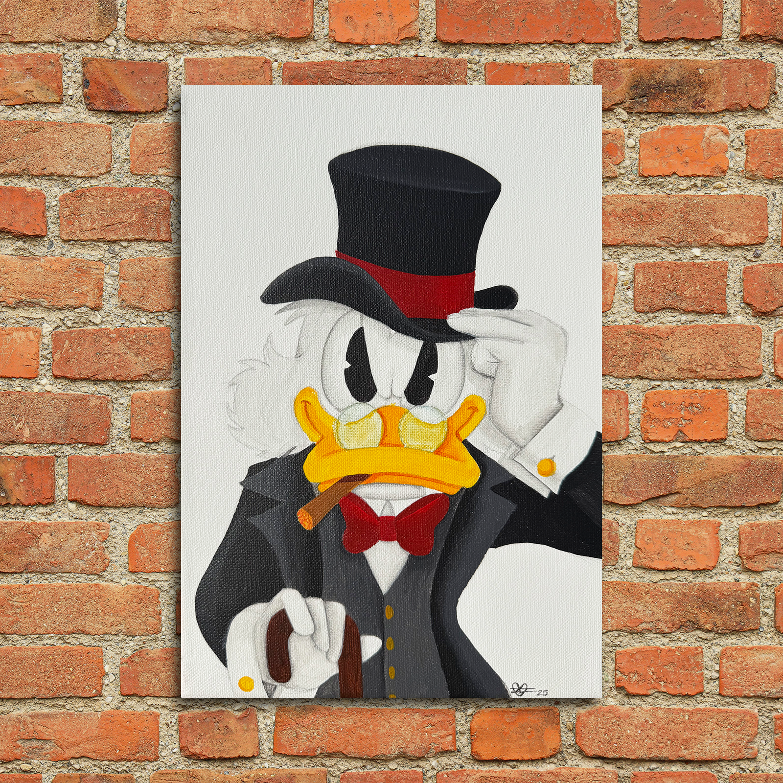 Motivet spiller på makt, penger og personlighet – en ikonisk and i smoking, med flosshatt og sigar, som fanger selve essensen av kapitalens ansikt.
